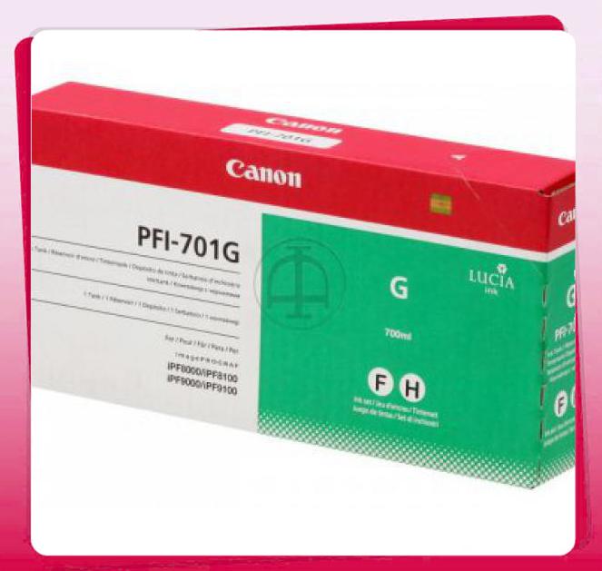 Mã mực: Mực in Canon PFI-701 Green Ink Tank Loại mực: In phun khổ lớn hướng dẫn , màu xanh lá Dung lượng: Hộp 1 ống 700 ml Bảo hành: Chính hãng Giao hàng: Miễn phí TPHCM